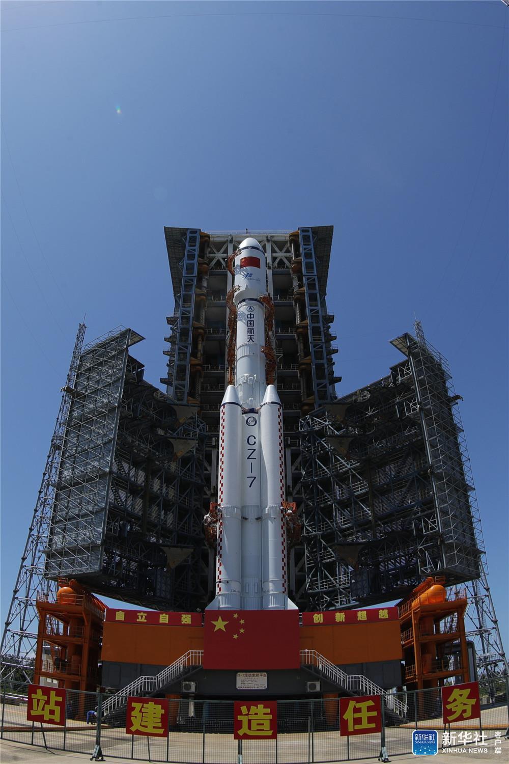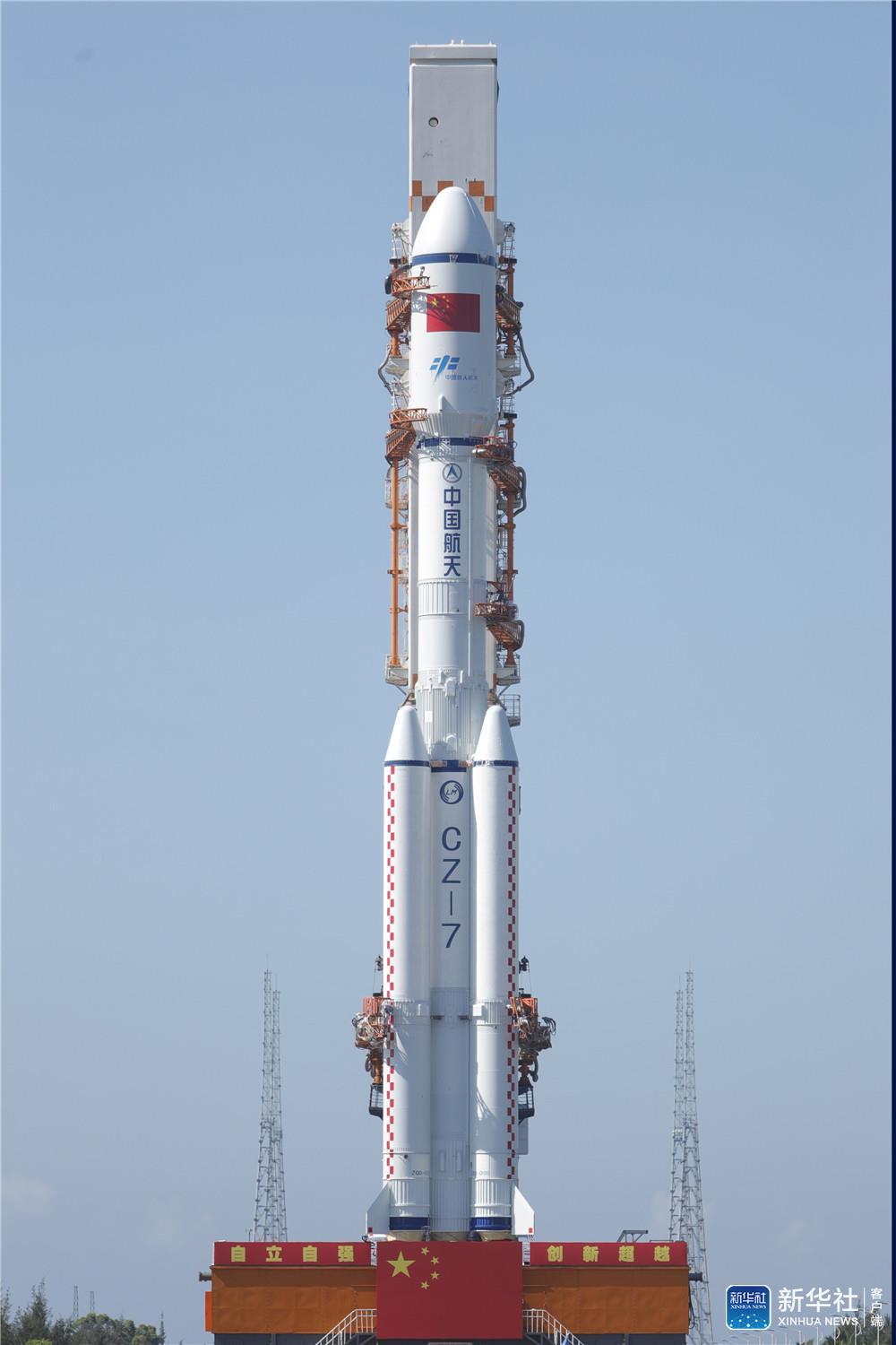 ↑5月16日,天舟二号货运飞船与长征七号遥三运载火箭组合体转运至发射区。新华社发(郭文彬 摄)