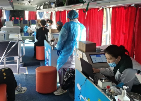 群众在流动疫苗接种车外登记准备接种新冠疫苗。(兰州市城关区委宣传部供图)