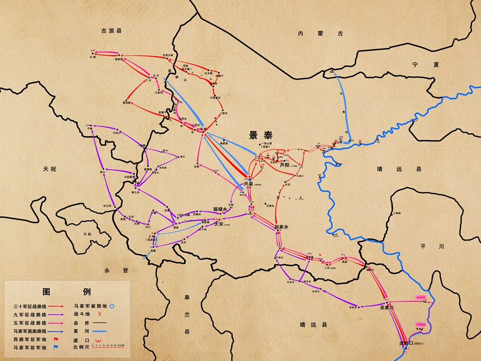 据史料记载,21800余名红军战士在景泰浴血奋战15天,足迹遍及景泰三分之二的乡村,进行了一条山战斗、大拉牌战斗、雷家峡狙击战等20余次战斗,共歼敌3000多人,击毙敌河防前线总指挥(少将参谋长)马廷祥。这给据守景泰的马步青部队以沉重的打击,打破了国民党反动派在景泰的防线,控制了靖远至五佛寺一线的黄河渡口。