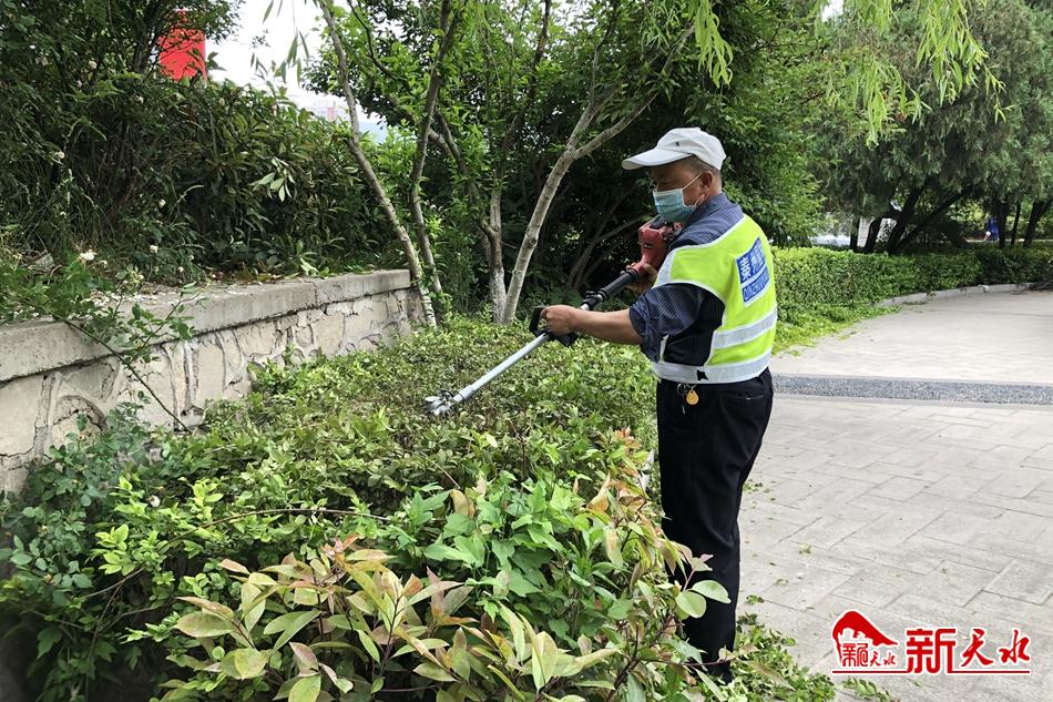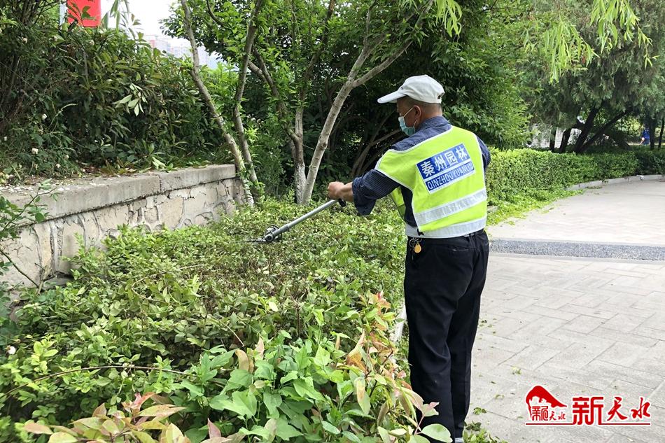 5月16日,园林工人正在对秦州区滨河北路绿化带苗木进行修剪。经过精心修剪后的苗木,整齐美观、生机盎然,进一步美化了城市环境。 (新天水记者 孙燕芸 摄)