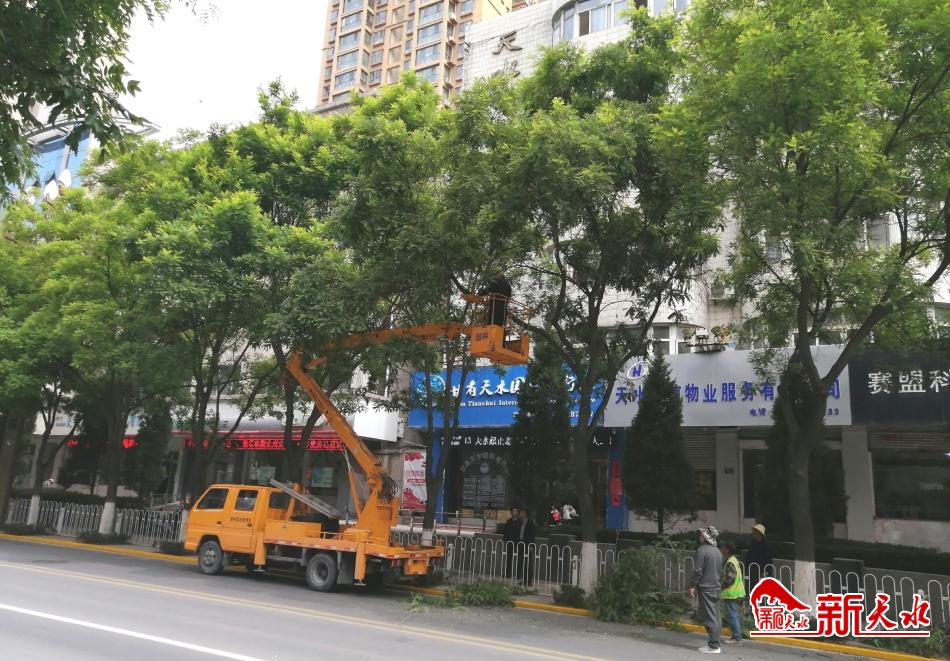 近段时间,园林部门组织人员和机械设备,对城区主街道两侧繁茂的行道树枝进行修剪,重点清理了行道树的枯枝、修剪影响车辆通行及有碍通行视线的低垂枝叶及影响交通指示牌、红绿灯等设施的树枝,以保障安全亮堂的畅行环境及空间,展示良好的城市环境及形象。(新天水记者 王莹 摄)