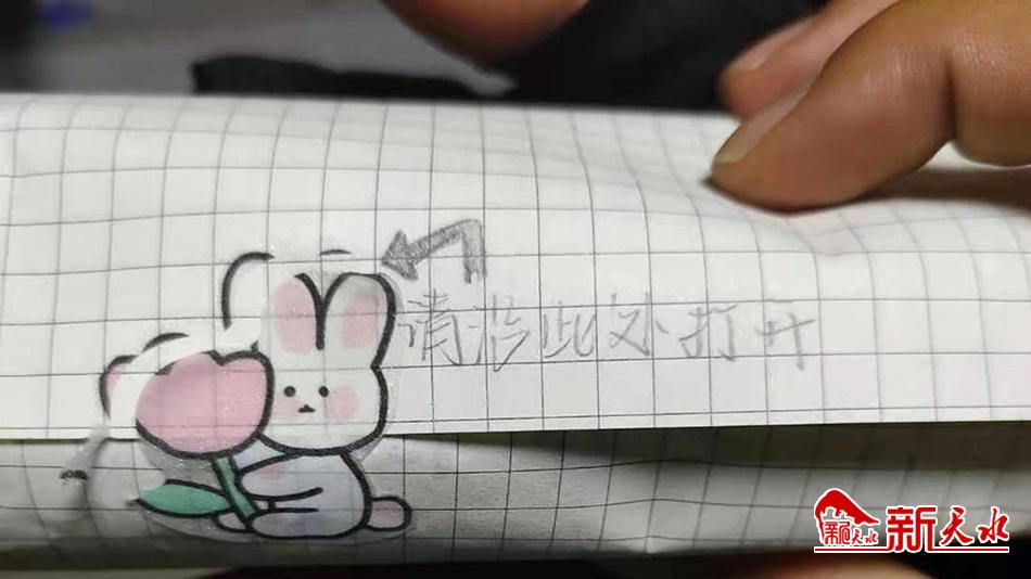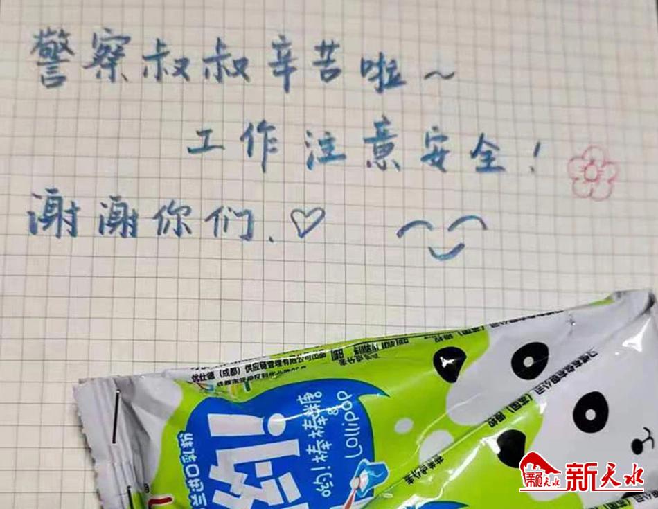 执勤队员查看纸包时发现是一张贴有可爱兔子并注明打开方式的小纸包。打开纸包的瞬间,执勤队员被里面的糖果和贴心的问候暖到了,上面写着“警察叔叔辛苦啦~工作注意安全!谢谢你们!”