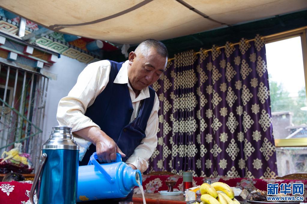 洛琼在倒酥油茶。(阿旺龙都摄)