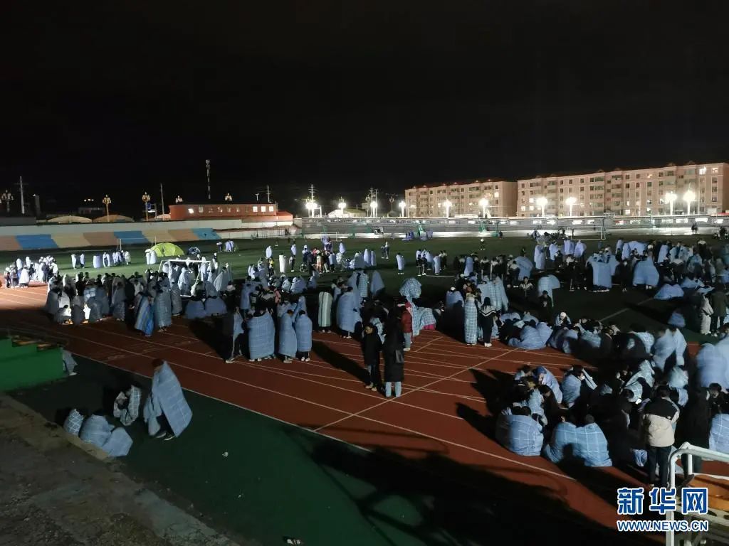 5月22日凌晨,在青海省果洛藏族自治州州府玛沁县,果洛州民族高级中学的学生在操场避险。新华社发