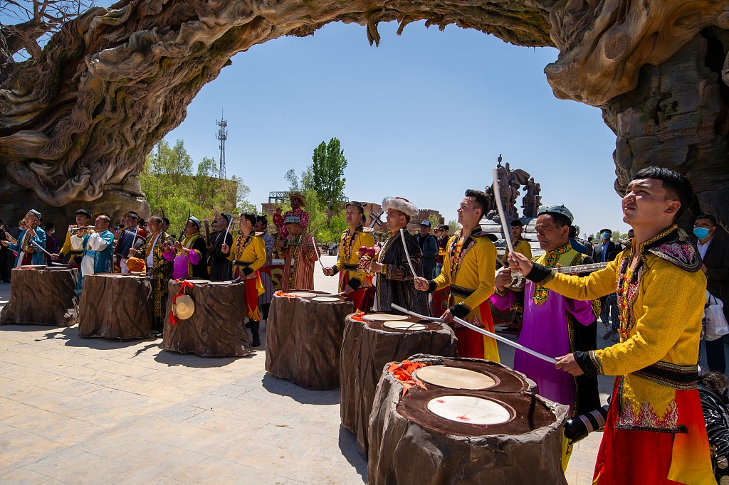 在新疆喀什,维吾尔族民间艺人正在演奏传统音乐。(图源:视觉中国)