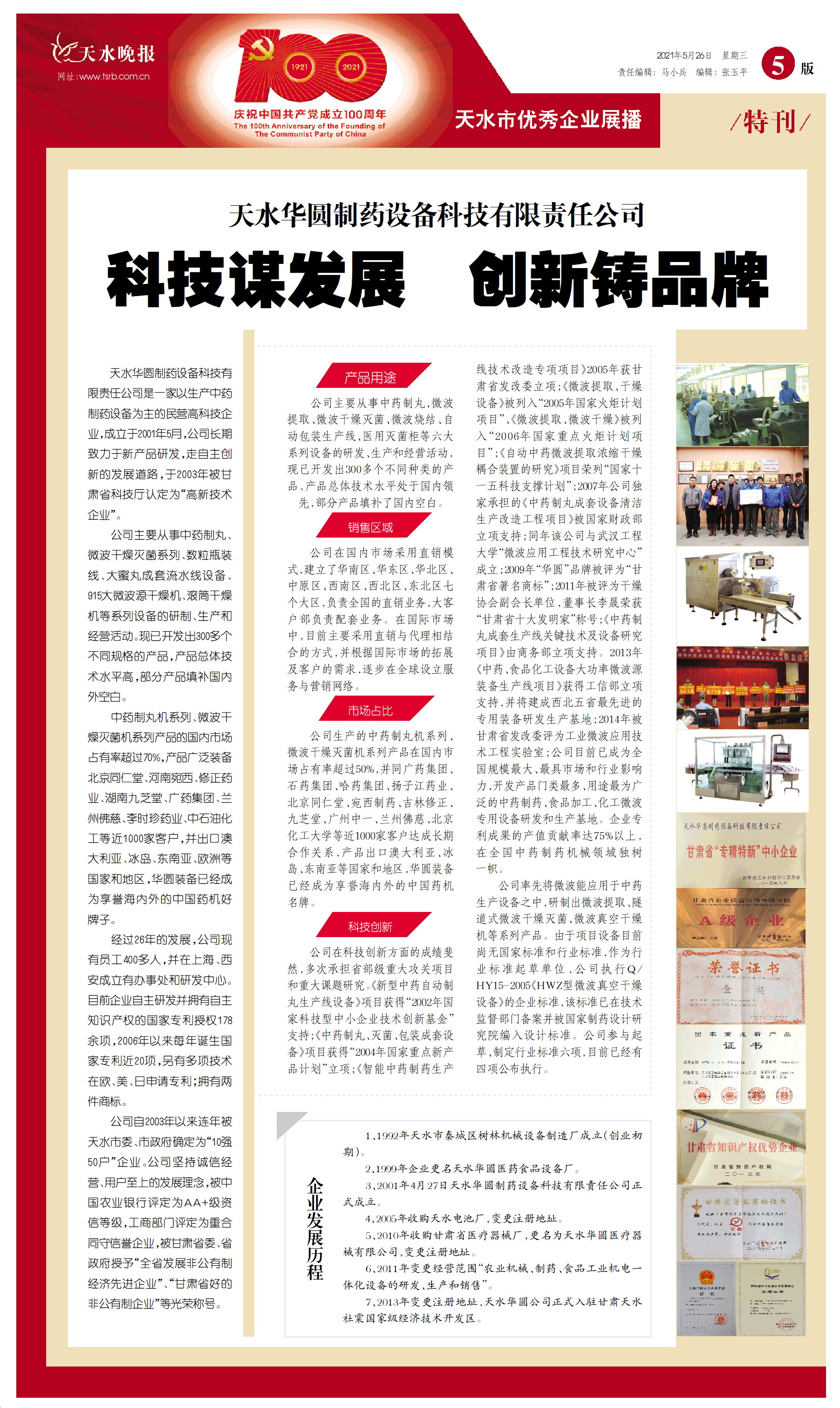 特刊|《庆祝中国共产党成立100周年,天水优秀企业展播》——天水华圆制药设备科技有限责任公司