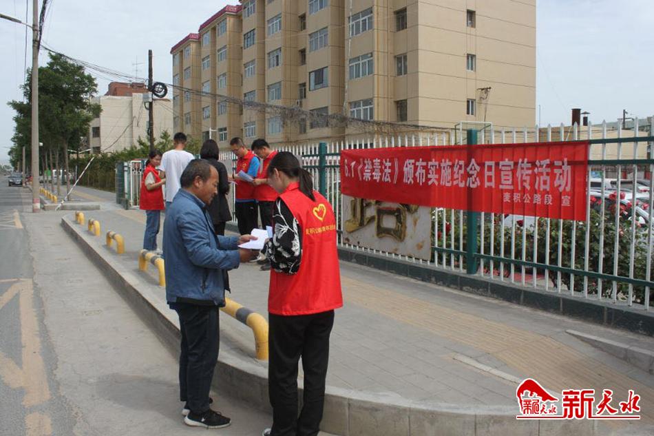 新天水讯【通讯员 李斌】5月31日,在《中华人民共和国禁毒法》(以下简称《禁毒法》)颁布实施13周年之际,为了让《禁毒法》的主要内容和精神更加深入人心,进一步提高广大群众识毒、防毒、拒毒的意识与能力,麦积公路段禁毒志愿者在社区开展了《禁毒法》颁布实施纪念日普法宣传活动。
