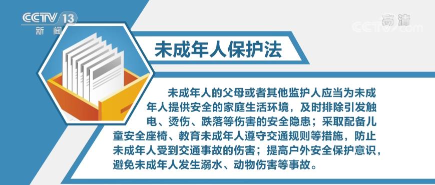 新修订的未成年人保护法规定:未成年人的父母或者其他监护人应当为未成年人提供安全的家庭生活环境,及时排除引发触电、烫伤、跌落等伤害的安全隐患;采取配备儿童安全座椅、教育未成年人遵守交通规则等措施,防止未成年人受到交通事故的伤害;提高户外安全保护意识,避免未成年人发生溺水、动物伤害等事故。