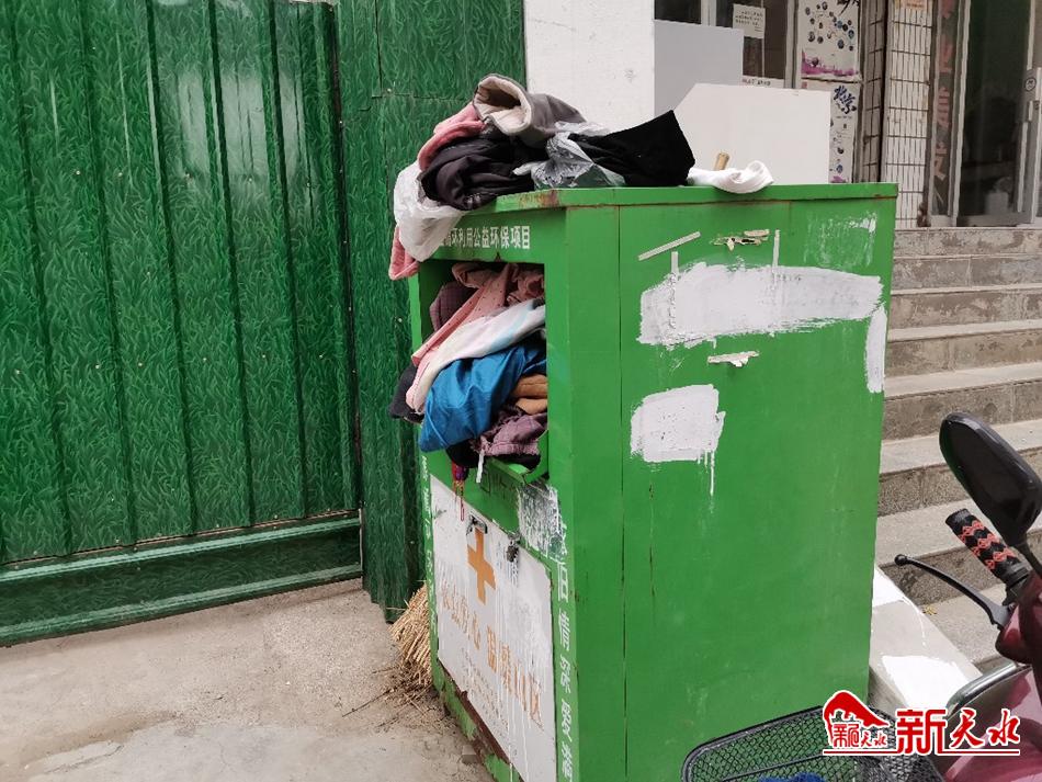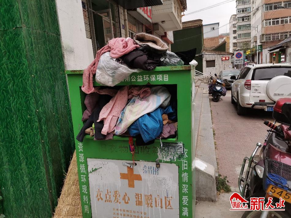 6月1日,在秦州区共和巷,一旧衣物回收箱衣物外溢,望相关部门在尽快处理的同时,市民多走几步路投放到别的箱子,共同爱护城市形象。(夏雨 摄)