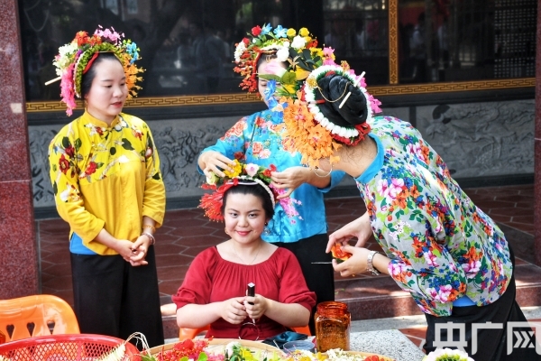 接着在髻心周围、左右对称插上几支大红、桃红艳丽的簪花、绢花或鲜花,再插上金或银制成的双脚发钗或梳子。整个头上打扮得犹如一座春意盎然的小花坛,美丽芬芳。