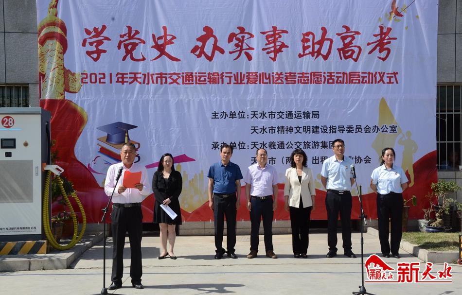 新天水讯【记者蔚军平】6月4日,以“学党史 办实事 助高考”为主题的2021年天水市交通运输行业爱心送考志愿活动启动仪式在天水中心客运站举行,此次活动由天水市交通运输局、天水市精神文明建设指导委员会办公室主办,天水羲通公交旅游集团、天水市(两区)出租车协会承办。