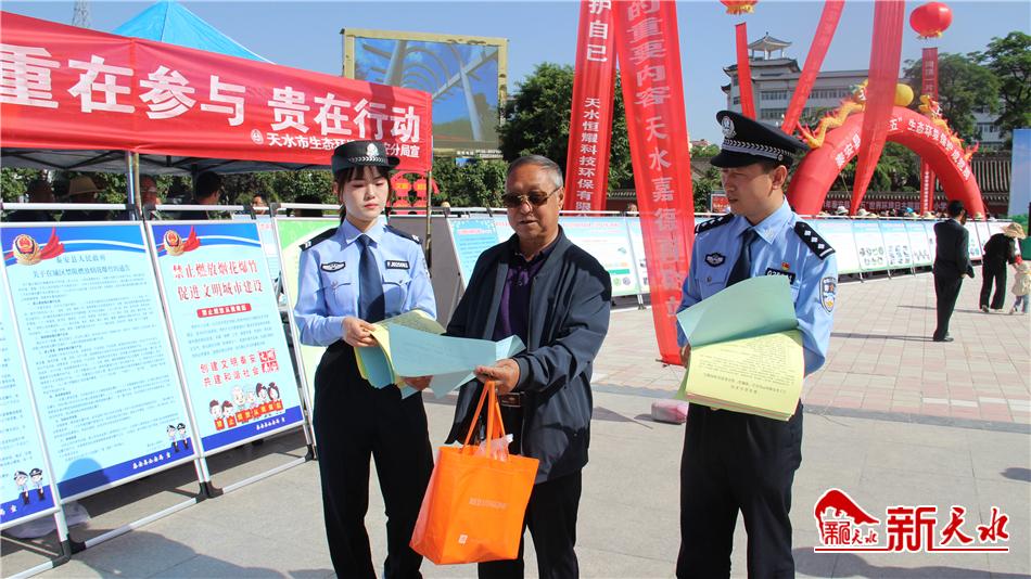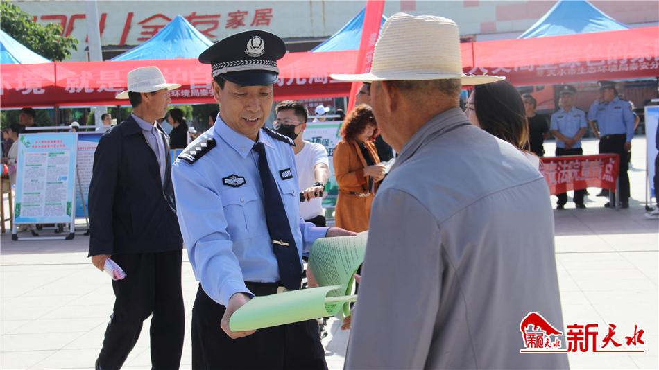 新天水讯【记者 张彬霞】6月4日上午,秦安县公安局组织民警在兴国镇文化广场开展了以“人与自然和谐共生”为主题的六五环境日宣传活动。