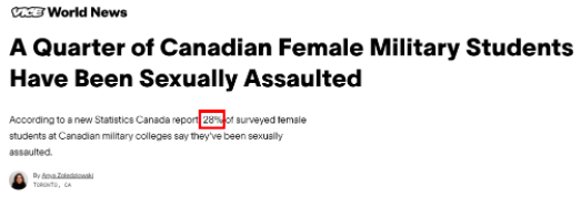 另据加拿大统计局公布的一份报告,有28%的加拿大军校女生遭受过性侵犯。