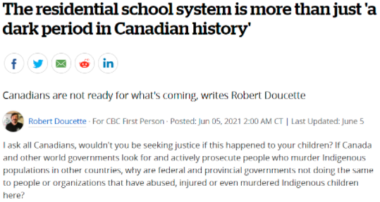 他在一篇文章中质问:“如果加拿大和其他国家的政府积极起诉在他国谋杀原住民的人,为什么加拿大联邦和省政府没有对在这里虐待、伤害和谋杀原住民儿童的个人和组织采取同样的行动?”