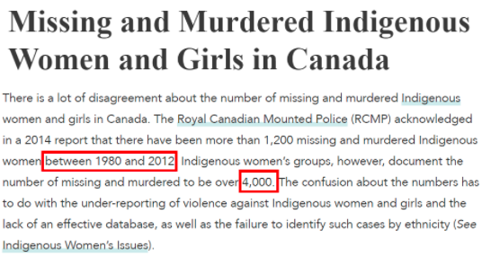 原住民儿童的悲惨命运同样出现在原住民女性身上。加拿大警方的记录显示,在1980至2012年间,该国将近1200名原住民妇女和女童失踪或被谋杀。而根据原住民妇女团体的记录,失踪和被杀的妇女和女童超过4000人。