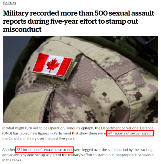 加拿大国防部向议会提交的相关数据显示,仅在2016年4月到2021年3月这5年时间里,加军方就收到581份性侵犯报告以及221项性骚扰记录。