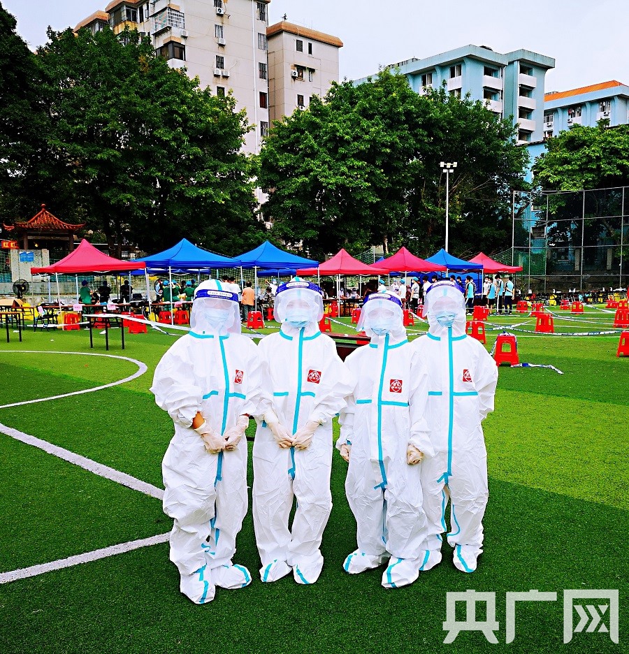 在鹤园足球场的核酸采样点,医护人员需要马上穿上防护服,投入工作。