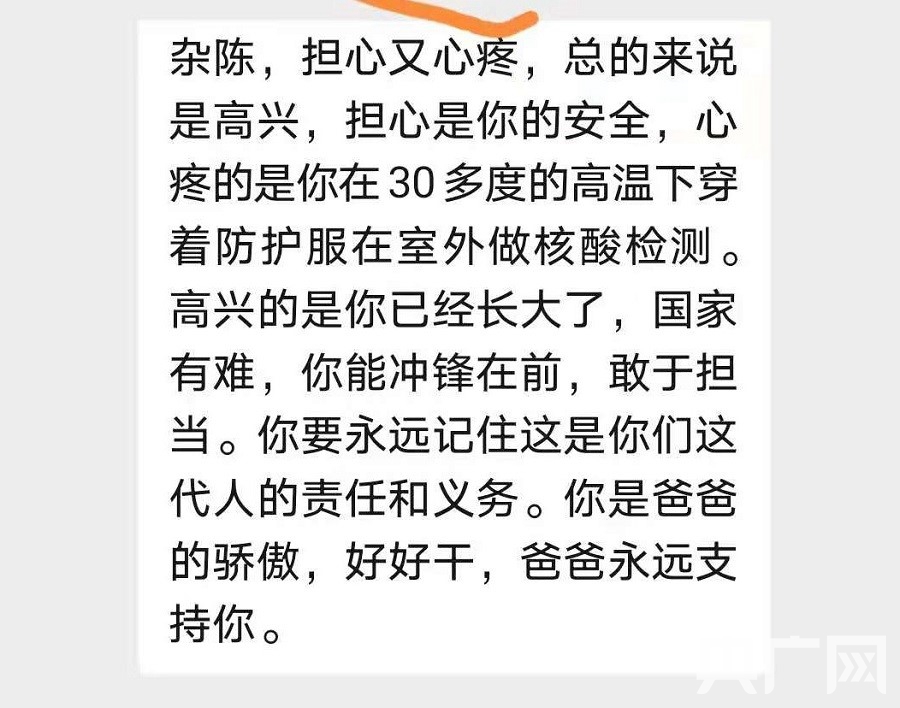 那天的核酸采样工作直到凌晨三点才结束,胡洋洋回到家中已经是凌晨四点多。但没想到,一向沉默寡言的父亲,不仅一直在等着自己,还留下了一段话。