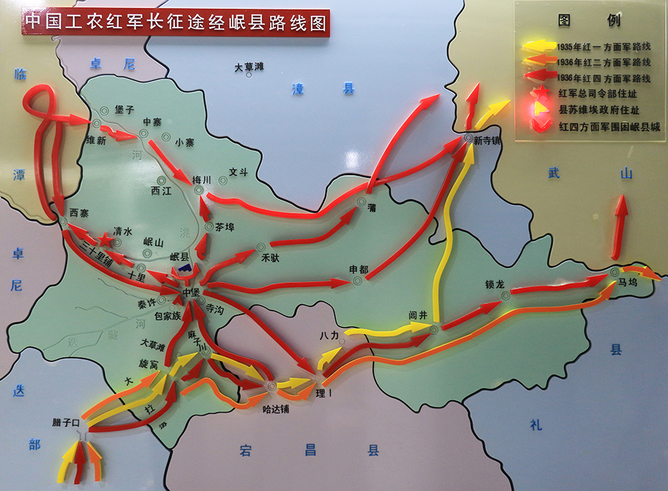1936年8月,红军二、四方面军为贯彻中央“岷洮西战役计划”,再次突破腊子口,到达岷县。岷县百姓热爱红军,为红军捐粮400多万斤、捐赠大批军需物资。从8月8日进入岷县至10月4日撤离,红军在岷县作战休整达57天,体力得到极大恢复,并得到超过3000兵源的补充,为继续北上打下基础。同时,红军在十里乡三十里铺村红军总司令部驻地成立甘肃省第一个省级红色政权——甘肃省苏维埃政府,并先后在西川、麻子川、哈达铺、理川等地建立苏维埃政府达36个。