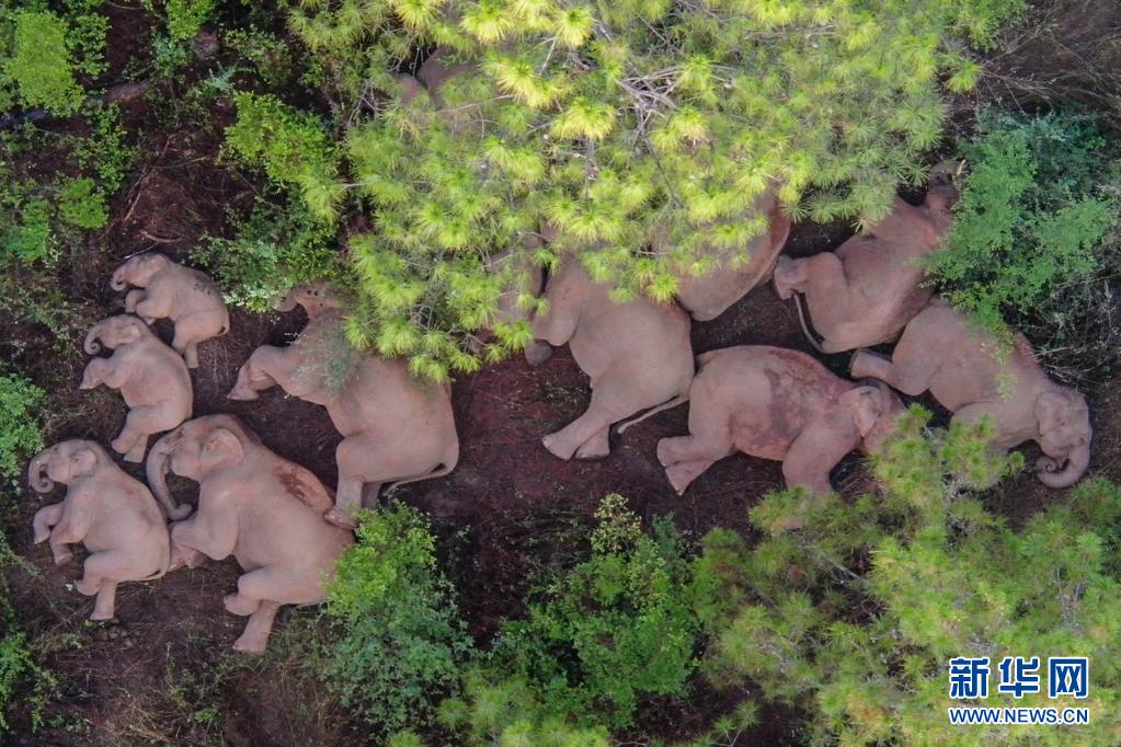 这是6月13日在云南省玉溪市易门县十街乡拍摄的象群(无人机照片)。新华社发