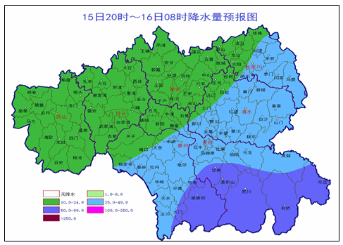 6月15日夜间,武山县、甘谷县、秦安县中雨;秦州区、麦积区、清水县、张家川县大雨,其中秦州区南部、麦积区南部部分乡镇有暴雨