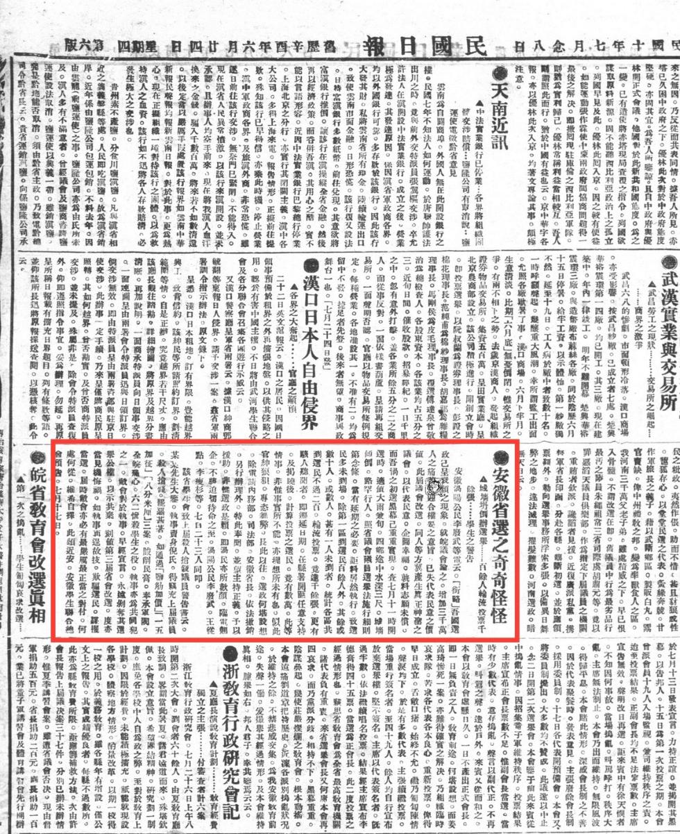 再看7月28日的《民国日报》,一则《安徽省选之奇奇怪怪》的新闻,直指资产阶级政府“城墙坍倒办选举”“百余人轮流投票千余张”的虚伪行径。作者直言:“长此以往,选政何堪设想?”