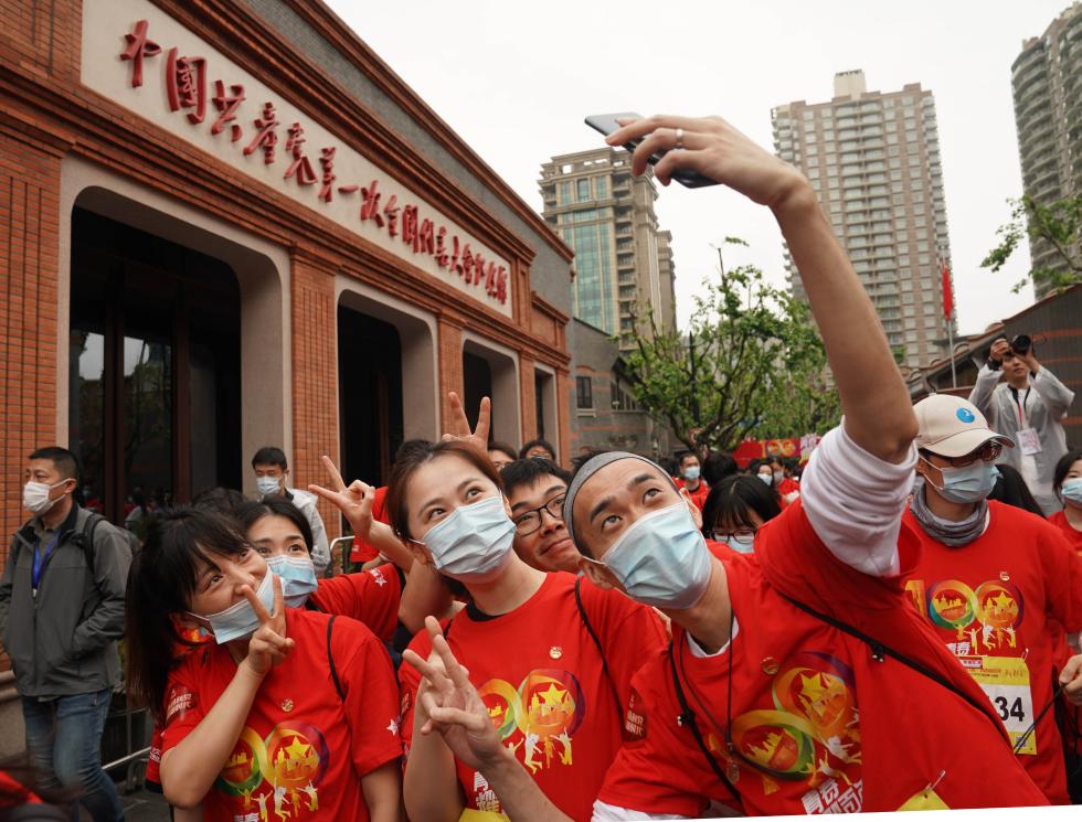 参加青年节活动的青年在中共一大纪念馆前自拍合影(5月4日摄)。新华社记者 刘颖 摄