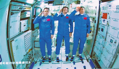 6月17日在北京航天飞行控制中心拍摄的进驻天和核心舱的航天员向全国人民敬礼致意的画面。在神舟十二号载人飞船与天和核心舱成功实现自主快速交会对接后,航天员乘组从返回舱进入轨道舱。北京时间2021年6月17日18时48分,航天员聂海胜、刘伯明、汤洪波先后进入天和核心舱,标志着中国人首次进入自己的空间站。新华社记者 金立旺摄
