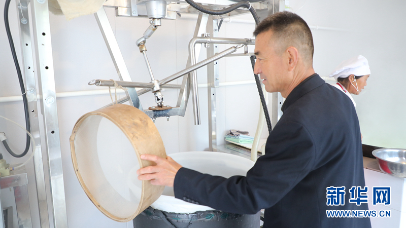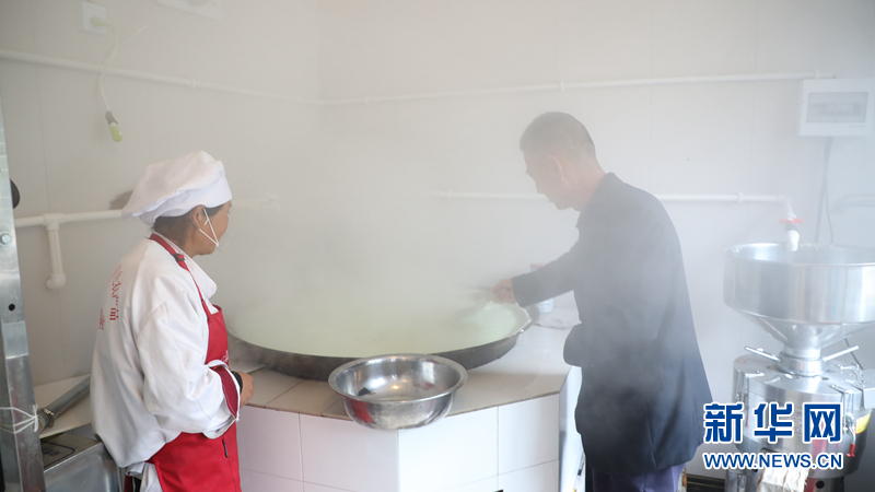 梅建顺(左)正在查看制作豆腐的工具。新华社记者 李杰 摄