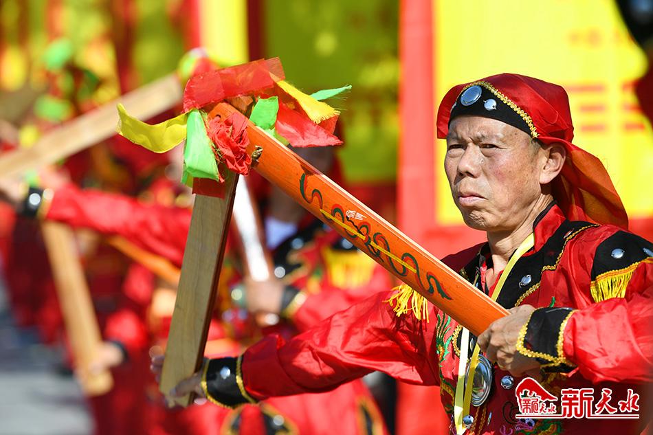 祭文恭读毕,现场全体人员面向伏羲庙行三鞠躬礼。随后,乐舞告祭拉开帷幕。手握旋鼓的舞者,迈着激昂的步伐步入圣坛,迎接来自海内外的华夏儿女共祭羲皇;手持高香的长者带领高举龙旗华盖的仪仗队分列祭坛两侧,面向伏羲庙,追念人文始祖。在恢弘的礼乐声中,虔敬而盛大的祭祀乐舞徐徐展开,舞者们聚合穿插、次第组合,演绎伏羲“画八卦、结网罟、制嫁娶、造琴瑟”的丰功伟绩,手捧寿糕、点心、鲜果、花束、高香等贡品的乐舞人员,向中华人文始祖伏羲圣像敬献供品,缅怀伏羲氏的伟大圣德,表达华夏儿女追远怀古,万代景仰的情怀。