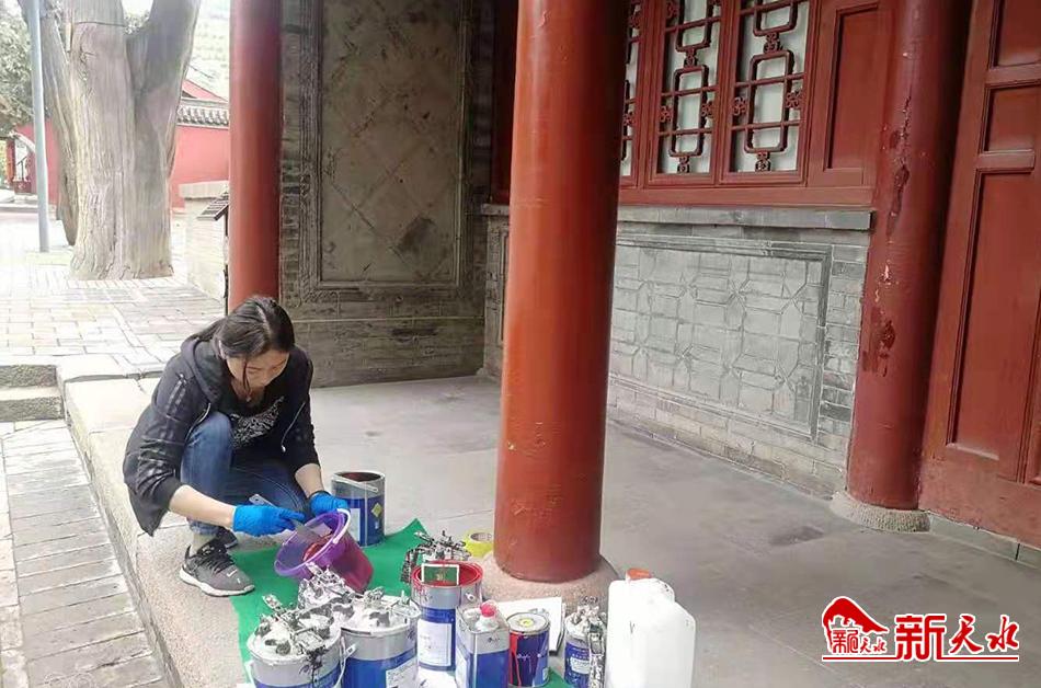 6月18日黄昏时分,游客散尽后的伏羲庙显得格外肃穆,而此时,刘燕芬和她的团队正在给伏羲庙内一些略显陈旧的设施做最后的刷漆修补工作,这已是刘燕芬连续第四年给伏羲庙做免费修补工作了。