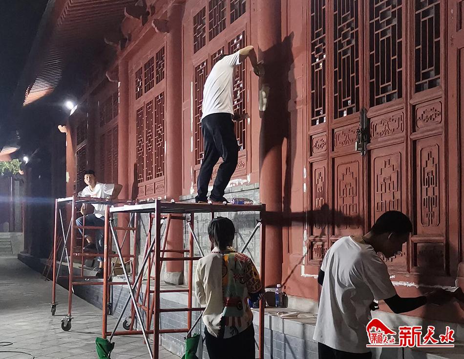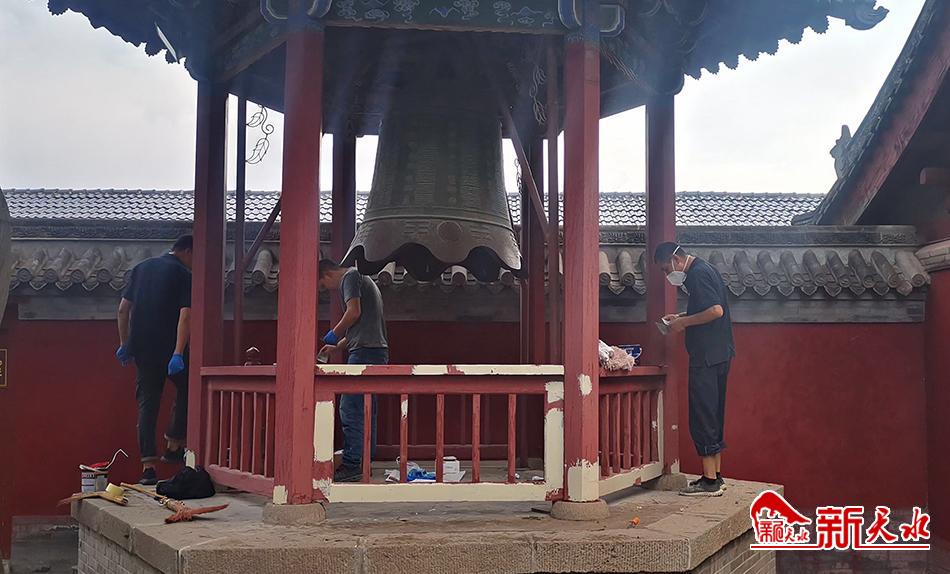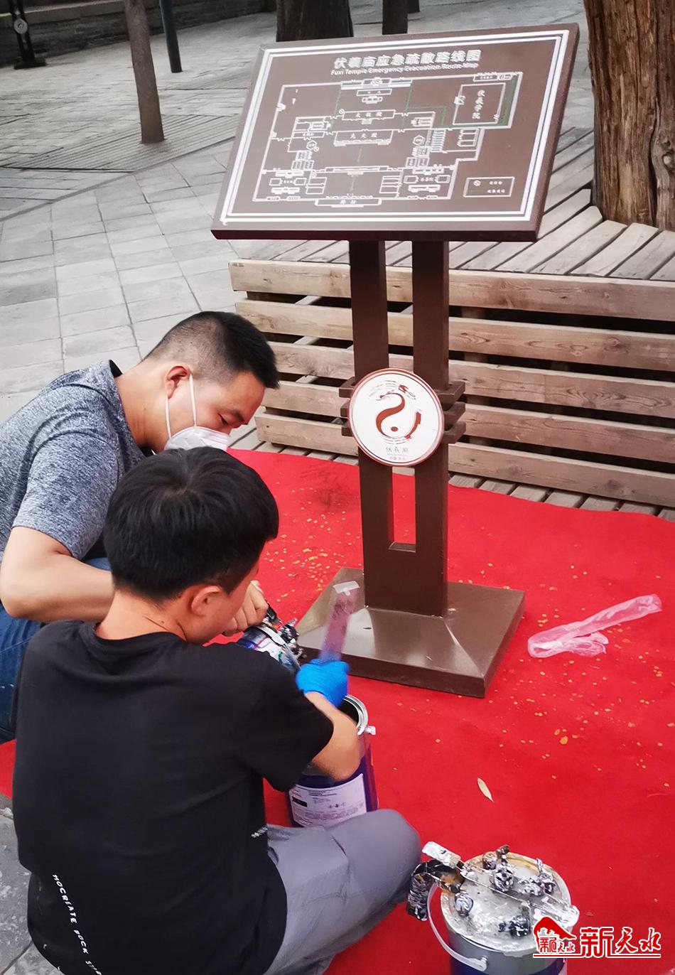 今年,刘燕芬和她的团队更是干了个彻底,除了伏羲庙门前的东西牌坊,庙门里的柱子、钟鼓楼、古树围栏,还有庙内部分仿古建筑的门面等,他们都进行了修补和重新刷漆。