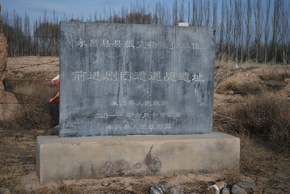 近日,记者来到永昌县东寨镇下三坝村,探访当年红西路军前进剧团的遗址。在初夏清晨的晨光中,看到马路边“中国工农红军西路军前进剧团战斗遗址”的指示牌和永昌县人民政府立下的遗址碑后,精神为之一振,感觉浑身热血沸腾。寂寞冷清的田野周围,仿佛幻化出当年红军将士为了理想血战马匪的战斗场面,军号声喊杀声马嘶声不绝如缕……