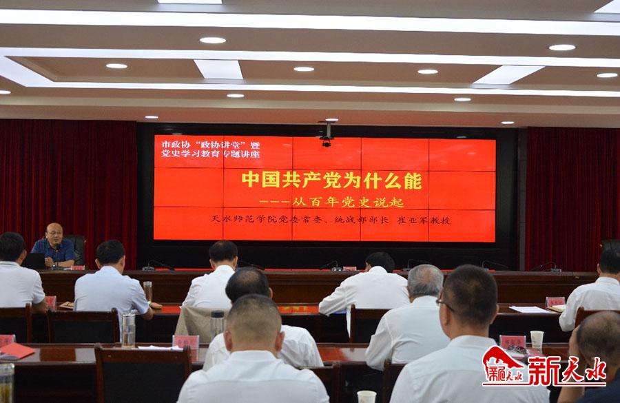 新天水讯【记者马哲】6月25日,天水市政协党组书记、主席赵卫东主持召开“政协讲堂”暨市政协党史学习教育专题辅导报告会,邀请市政协委员、天水师范学院党委常委、统战部长崔亚军教授为市政协机关全体党员作了题为《中国共产党为什么能——从百年党史说起》党史教育专题辅导报告。
