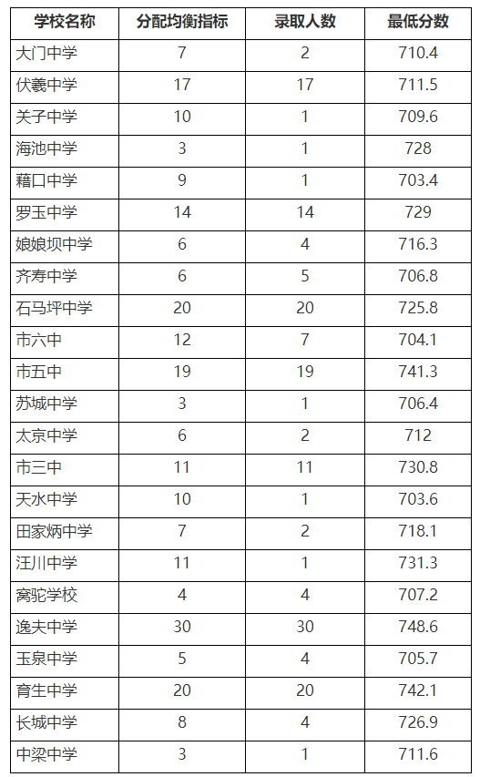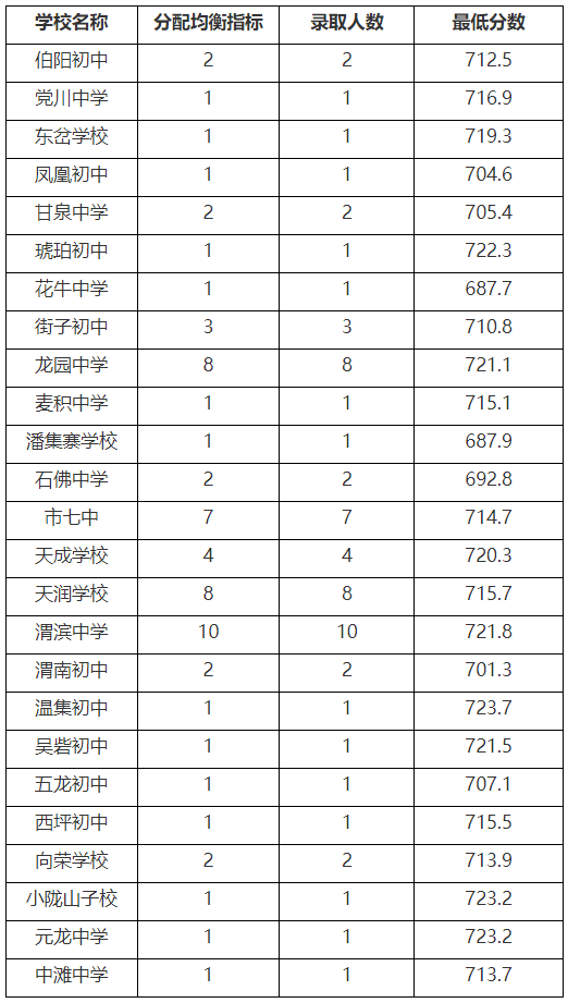 均衡生:以统招生第275名考生成绩753.3分为基准,下调50分作为均衡生最低录取线,即703.3分,按照天秦教字〔2021〕290号《秦州区教育局关于下达2021年秦州区普通高中招生计划暨均衡生分配计划通知》精神,指标到校,一校一线,实际录取172人,具体录取情况如下: