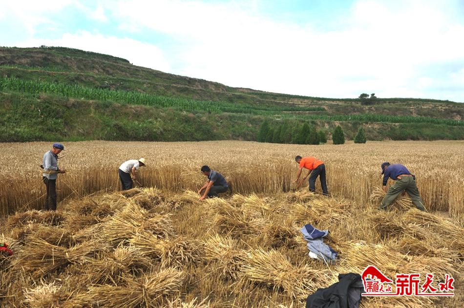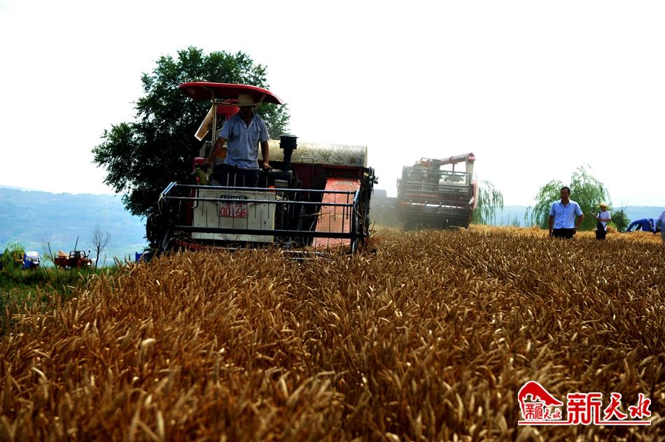 7月5日,武山县城关镇邓家堡子村,农民们有的从农具架子上取下收藏了一年的银镰, 有的叫来收割机,走进村庄后面名叫马家山、涌动着金色麦浪、散发着浓浓麦香的麦田里, 他们有的挥动着轻快的银镰,有的指引着收割机收割沉甸甸的麦穗……