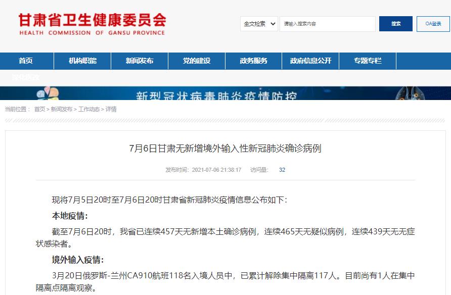 截至7月6日20时,甘肃省已连续457天无新增本土确诊病例,连续465天无疑似病例,连续439天无无症状感染者。
