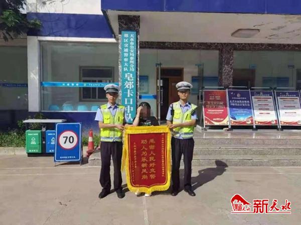新天水讯【记者 蔚军平】7月8日,秦州区齐寿镇的马女士来到秦州公安分局郊区交警大队皂郊卡口中队,将一面写有“感谢人民好交警,助人为乐新风尚”的锦旗赠送给执勤交警,对他们热心护送病人就医表示感谢。