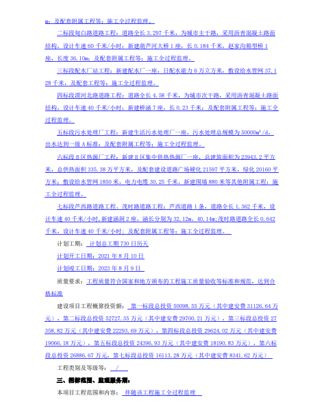 七标段芦西路道路工程、茂时路道路工程:芦西道路1条,道路全长1.362千米,设计车速40千米/小时,新建涵洞2座,涵长分别为32.12m、40.14m;茂时路道路全长0.642千米,设计车速40千米/小时;及配套附属工程等;施工全过程监理。