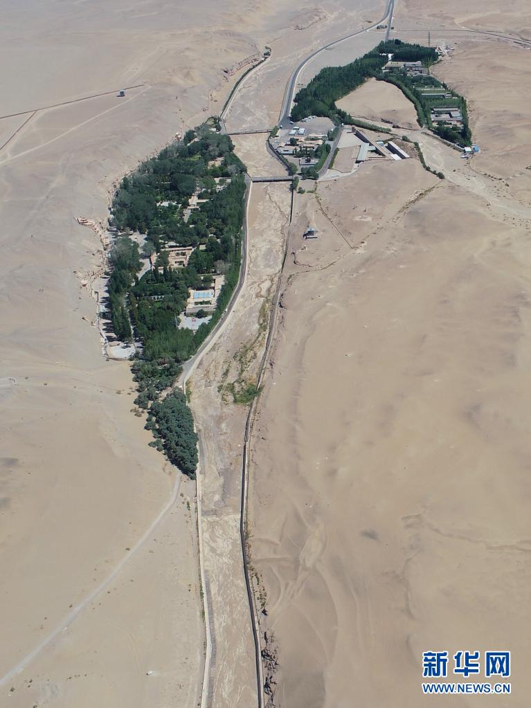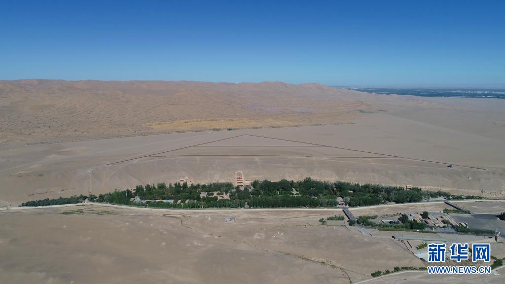 大泉河及其流经的敦煌莫高窟(7月6日摄,无人机照片)。新华社记者 刘诗平 摄