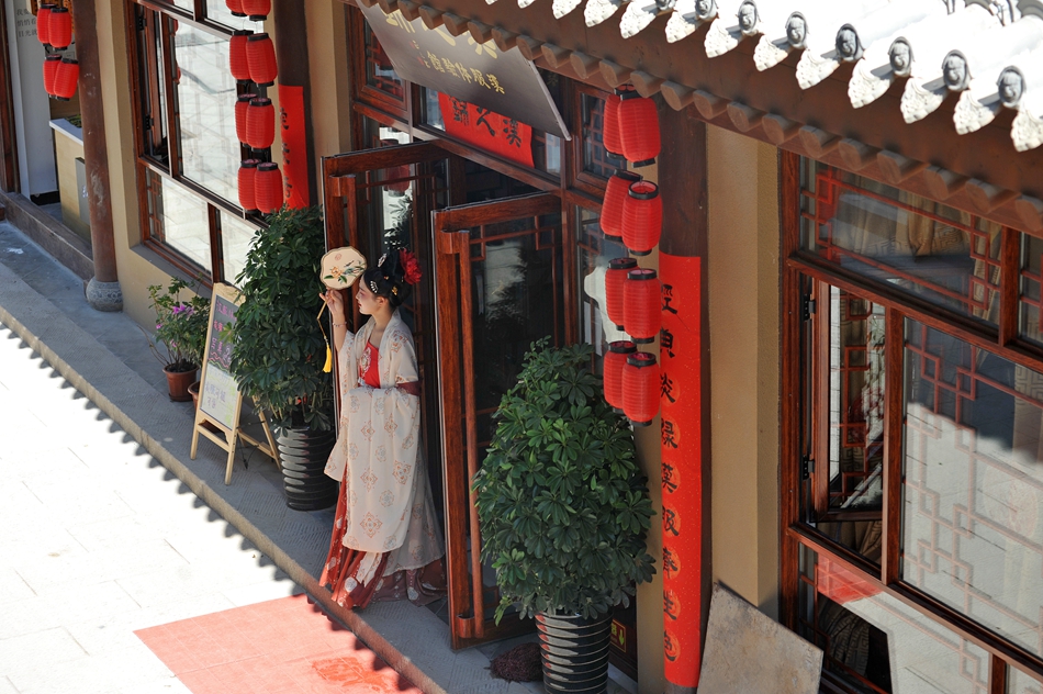 一位穿着汉服的姑娘走出古装店