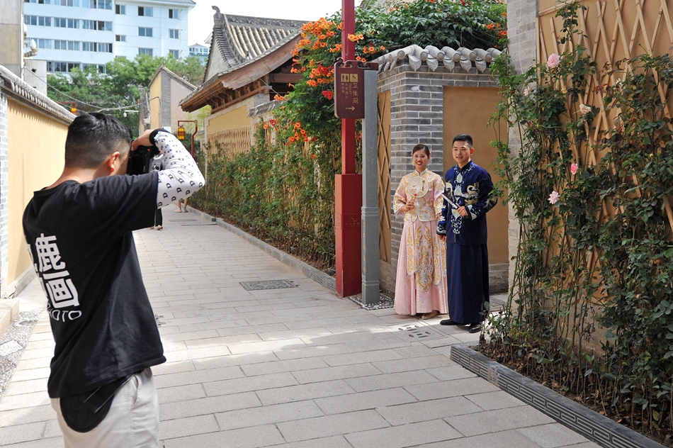 在古城街巷拍照的情侣