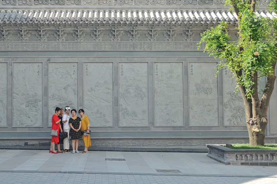 游客在秦州八景图案的浮雕画廊前拍照
