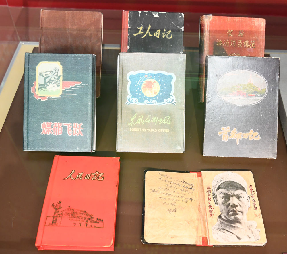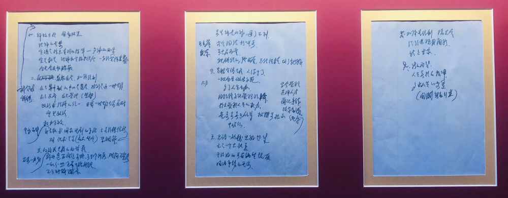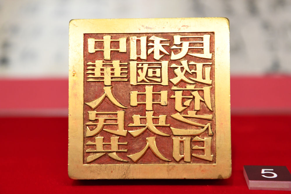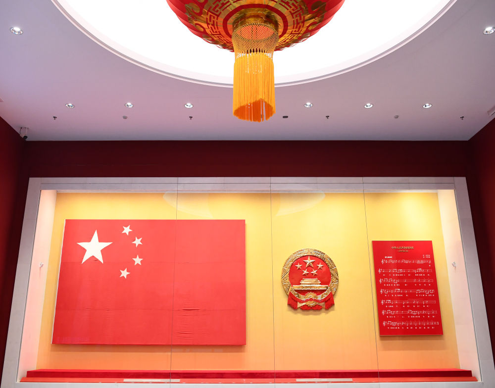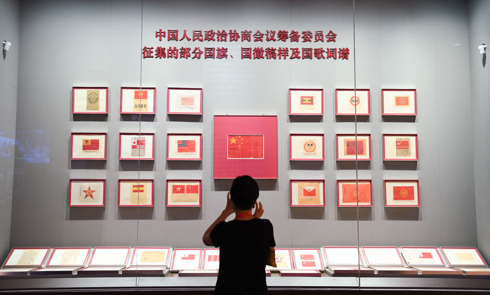 ↑一名参观者在参观“中国人民政治协商会议筹备委员会征集的部分国旗、国徽稿样及国歌词谱”。
