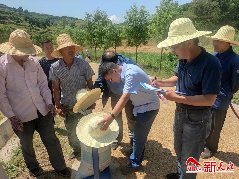 7月11日正午,气温36℃,在清水县王河镇李沟村,正在进行一场小麦实收测产。当天,省农业科学院邀请西北农林科技大学、市种子站、市农技中心等单位相关专家组成专家组,对李沟村种植的冬小麦新品种兰天36号进行实产验收。