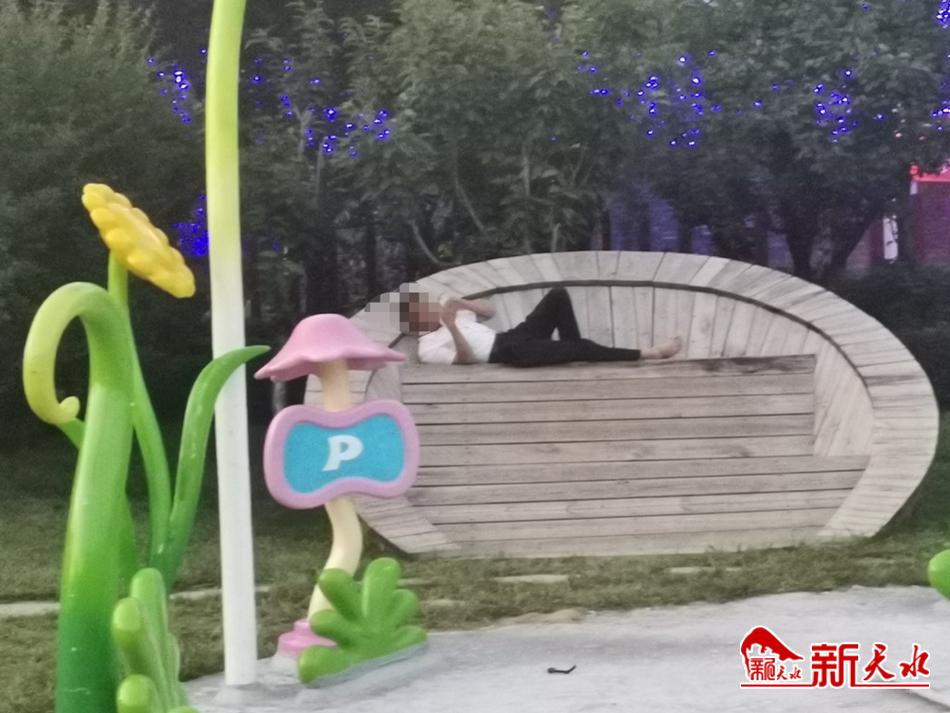 7月18日,在秦州区佳·水岸小镇,一男子脱了鞋袜躺在座椅上看手机。在公共场合,座椅是为了方便大家休息而设置的,希望大家都能够文明使用它。(夏雨 摄)