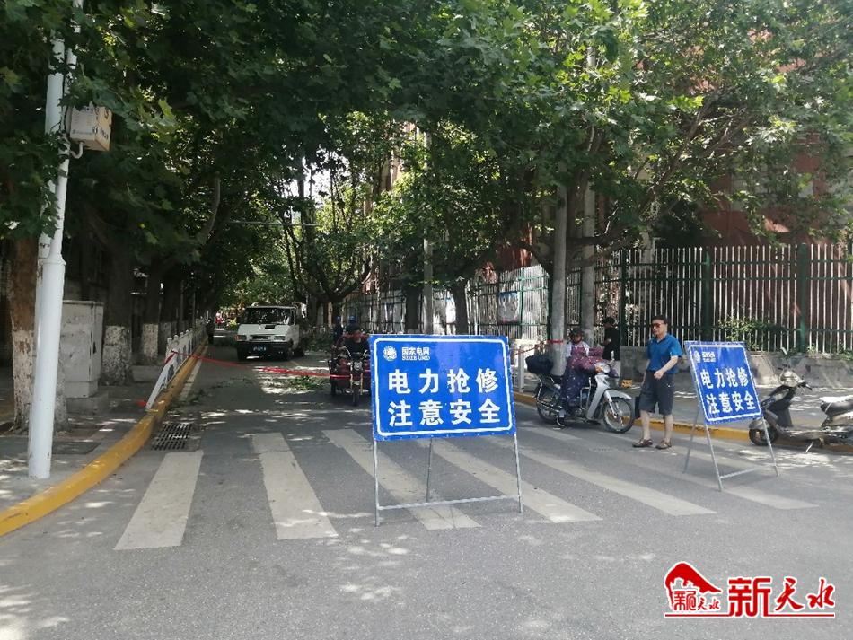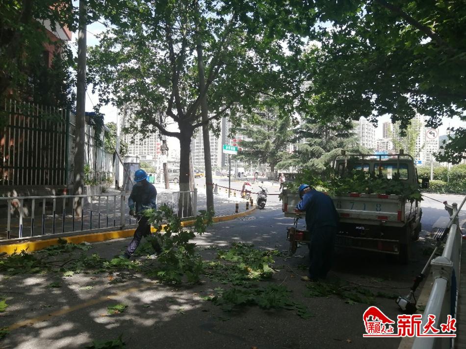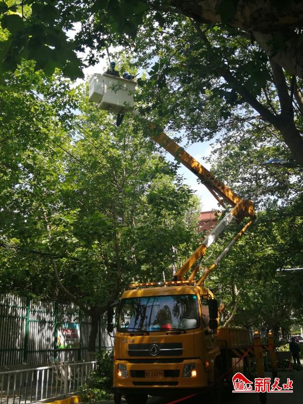 7月20日上午,记者在现场看到,合作南路北口已经设置了安全提示牌,在道路北段,工作人员将修剪后掉落下来的树枝进行清理装车,在道路南段,两名戴着安全帽的工作人员站在升降车上,由北向南逐一对影响供电安全的树枝进行修剪和清理,使树木和电线保持安全距离。