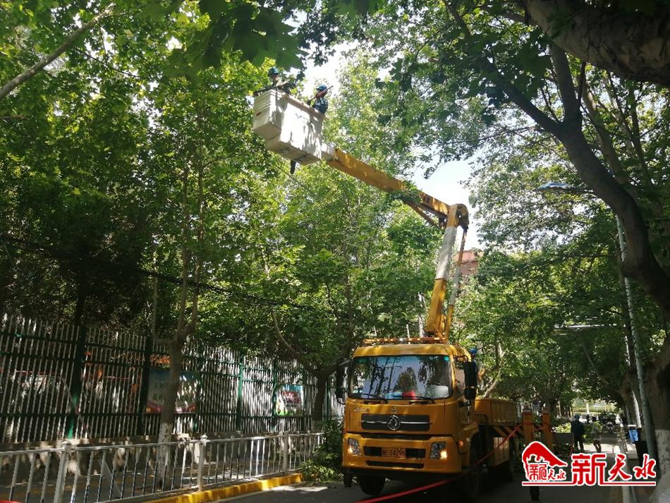 新天水讯【记者 蔚军平】7月20日,在秦州区合作南路,天水供电公司的工作人员使用专用设备对道路两侧行道树上长势茂盛的树枝进行修剪,消除用电安全隐患。