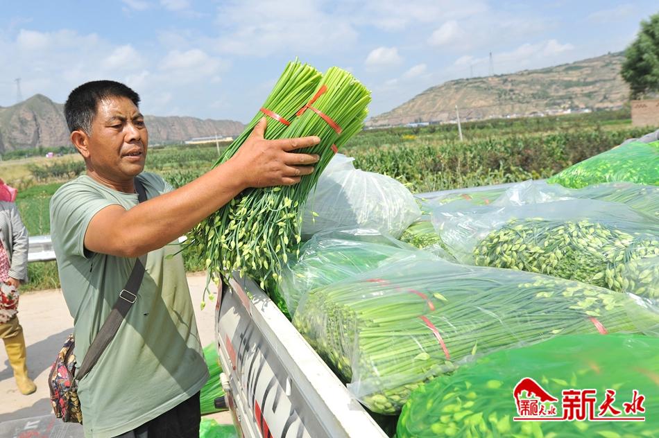 客商将甘谷县新兴镇马家磨村农民采收的韭苔装车