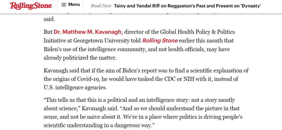 卡瓦纳说:“这告诉我们,溯源已经成为政治和情报调查,而不是一件与科学有关的事情。”我们应该从这个意义上理解美国所谓“病毒溯源”,政治正以一种危险的方式推动人们对科学的理解。